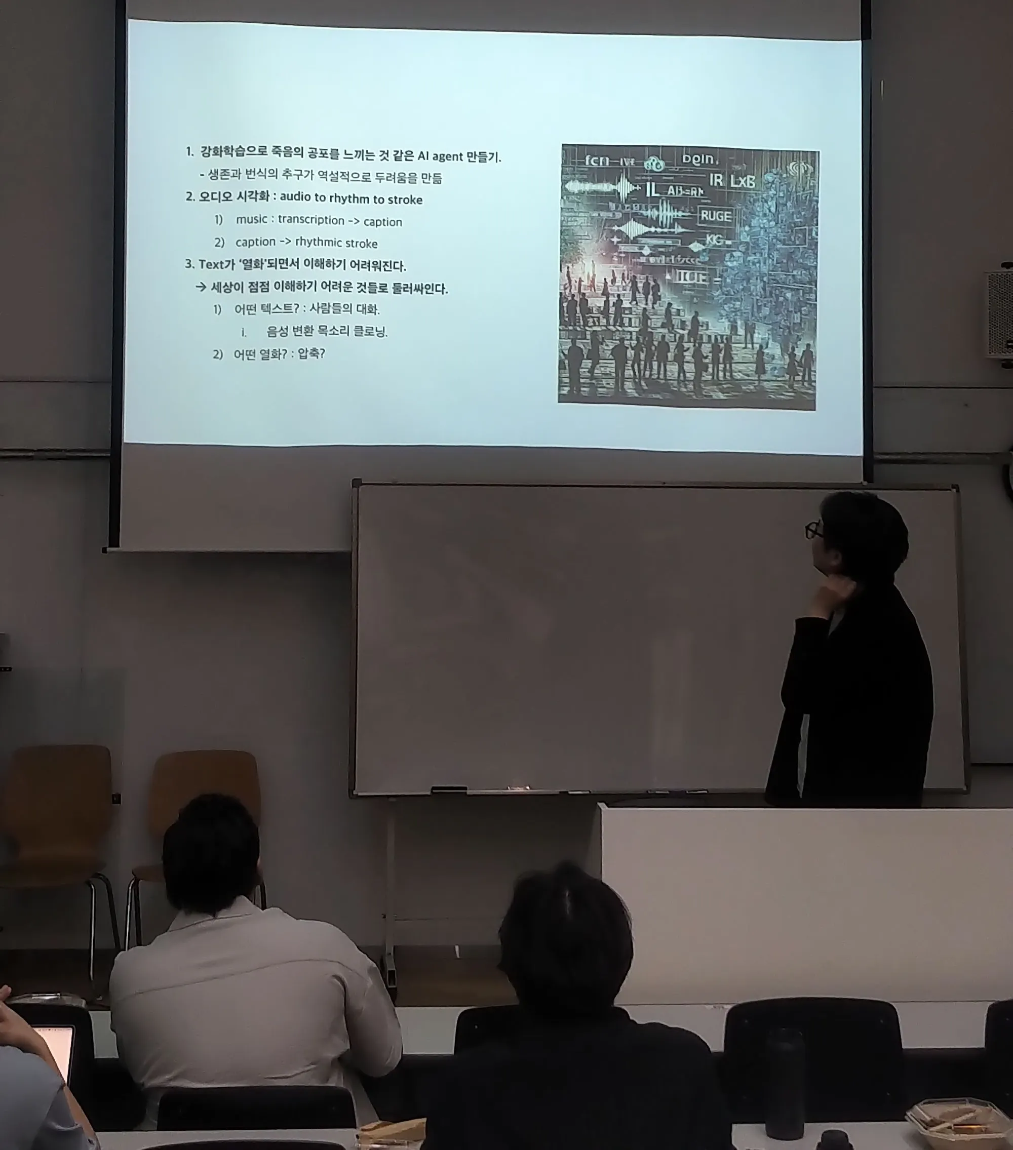 이후 약 10분 동안 신교명 작가님이 예비 해커톤의 주제를 소개해 주셨습니다. 이번 해커톤의 주제는 '포스트휴먼'으로, '포스트'가 '휴먼'과 '휴머니즘'을 수식하는 두 가지 관점을 바탕으로 하였습니다. 이러한 철학적 배경에서 AI와 관련된 논의점과 작업물 등을 자유롭게 의논하는 것이 이번 해커톤의 목표였습니다.