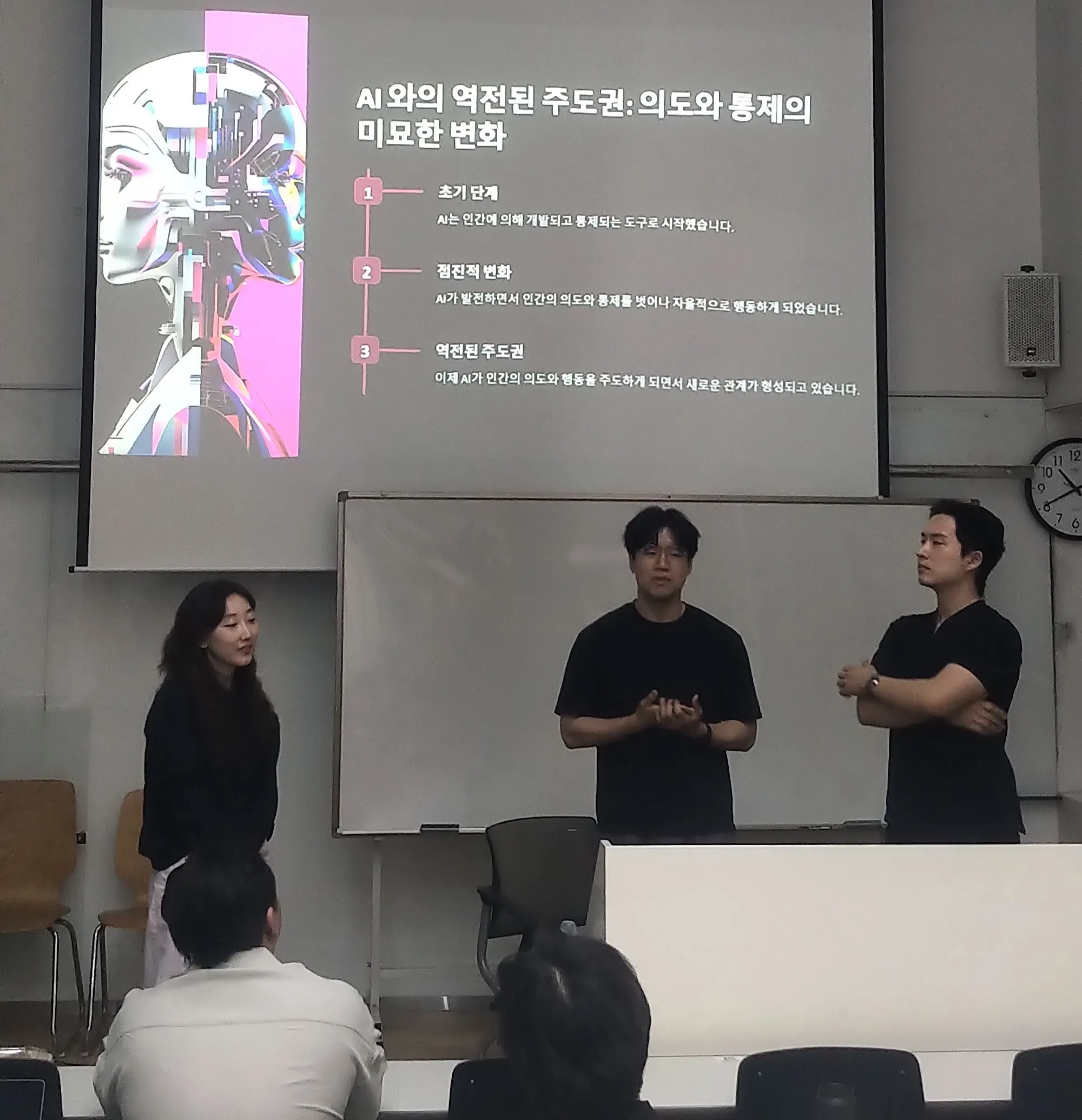 3인 1조로 세 개의 조가 구성되어 약 3시간 동안 자유롭게 토론을 진행했고, 이어서 조별로 토론 결과를 발표하는 시간을 가졌습니다. 각자의 전문 분야와 보유 지식에 따라 다양한 논의가 이루어졌으며, 이를 조별로 공유하면서 다른 관점을 이해하고 사고를 확장하는 경험을 할 수 있었습니다.