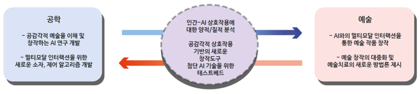 본 연구센터는 멀티모달 생성 AI를 개발하고 적용함으로써, 예술과 인간 간의 상호작용에 새로운 차원을 부여하며, 예술 창작 과정에서 생체신호, 시선 추적, 3D 모델링 등 다양한 데이터의 통합을 모색하고 있습니다. 또한, 공학과 예술의 융합을 통해 새로운 학문 분야를 창출하고, 이를 사회 전반에 적용할 수 있는 방안을 모색하고 있습니다.
